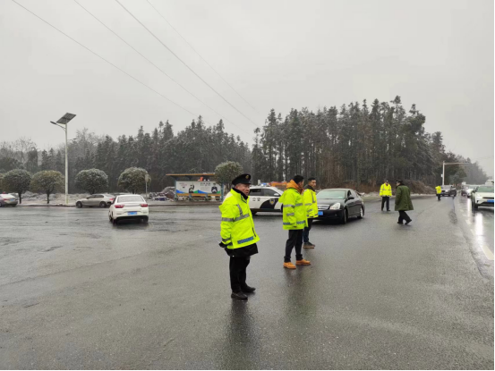 镇社会治安和应急管理办工作人员同值班领导、值班干部、各村(社区)志愿者们雪中日夜值守、疏导交通 彭皓云 摄