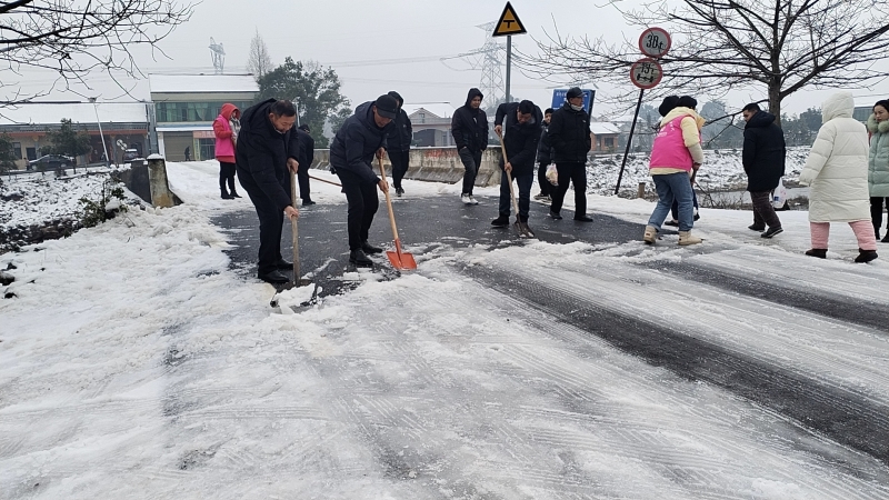 同心除雪保畅通。以动制“冻”,干群同心开展除雪保畅工作,组成了镇级层面由镇党委书记带领、村级层面由支书带队、小组网格层面由党员带动的“党员突击队”。深入到桃灰线、牛鸬线、牛大线等主要交通干道以及村(社区)交通要道开展扫雪除冰行动,并宣传发动周边群众一同参与到行动中来,合理调配融雪剂、铲雪车等应急资源,以“人防+物防”打好应对雨雪冰冻天气组合拳,用心用情用力筑牢人民群众安全墙。