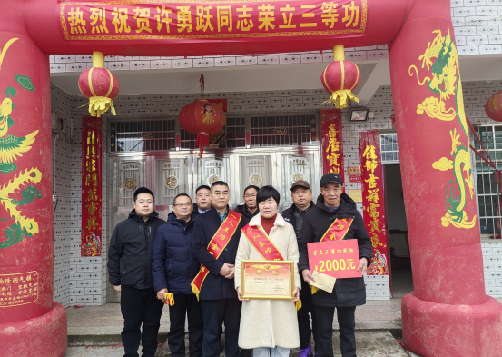 得知许勇跃在部队立了功,周边的亲朋好友都主动到他家燃放鞭炮以示祝贺,共享这份荣耀和喜悦。在喜庆的鞭炮声中,“热烈祝贺许勇跃同志荣立三等功”的红色横幅赫然醒目,当家属披上绶带接过喜报的那一刻,大家都鼓掌祝贺。