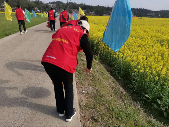 志愿者在湖莲坪万亩油菜花海清理沿路垃圾 郭晓 摄