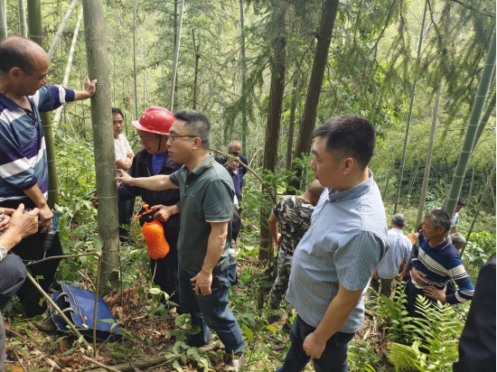 理论课后,林业专家带队到村上的竹林,就有效治理竹蝗进行了实地教学。