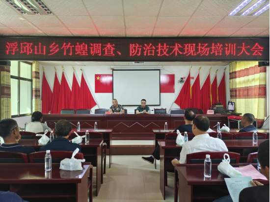 5月8日,浮邱山乡竹蝗调查、防治技术培训会在该乡田家冲村召开,乡林长办全体成员,全乡各村林业专干及竹蝗、竹青虫防治骨干参加。