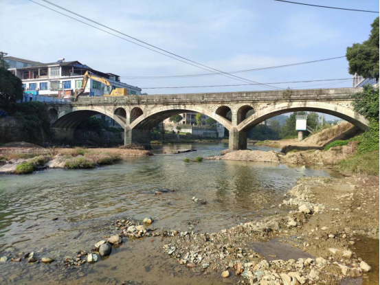 鸬鹚渡桥始建于1965年,跨沾溪河而建,是鸬鹚渡镇运输出行的主要过河通道。老桥上部结构为3*16m双曲拱桥,桥梁全宽6m,全长53.8m,下部结构为重力式桥台。因原桥梁运营时间长,拱波纵向开裂,拱肋破损露筋,腹拱出现横向贯通裂缝,墩台砌缝砂浆脱落,护栏破损、外倾,有倒塌趋势等病害,严重影响群众安全出行,拆除重建迫在眉睫。