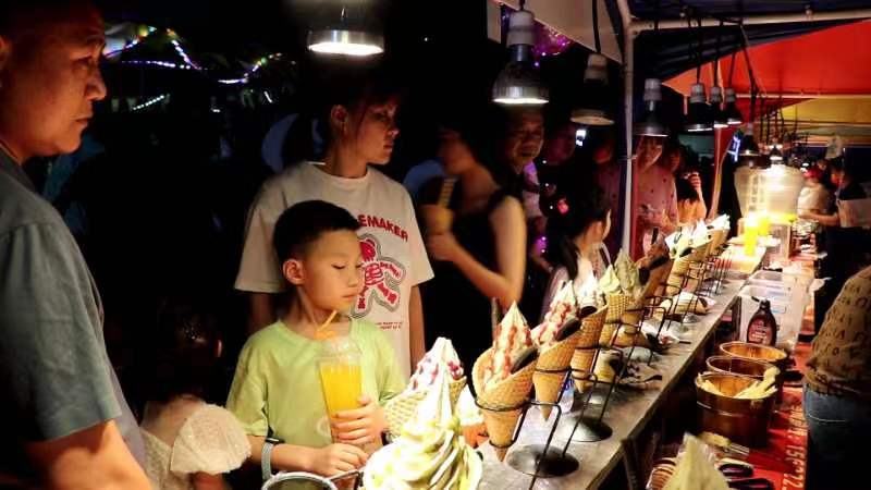 精彩的表演之后,更有丰富的美食。现场烹制的各种乡土美食琳琅满目、香气四溢。有淄博烧烤、陕西凉皮、老北京手工糖、长沙臭豆腐等上百种各地小吃,也有红薯米花糖、嗦螺排骨、手工擂茶等当地传统美食,让前来打卡的游客流连忘返、大快朵颐。此外,还有丰富多样的娱乐项目,如旋转木马、空气城堡、旋转飞椅等游乐活动。在洞宾民宿大厅火热上演的非遗文化皮影戏,更是吸引了大小孩子们的眼球。幕布前,精致的皮影栩栩如生,伴着铿锵有力的锣鼓声,表演者双手上下翻飞,熟练地操纵着“演员”,幕布上的人物随之灵活地动了起来,讲述着一个个故事,为游客们带来了一场精彩的“光影盛宴”。“今天是周末,我们带着两个小孩一起来的,在这里看表演、观美景、品美食,真的是不虚此行。”游客丁菲说道。