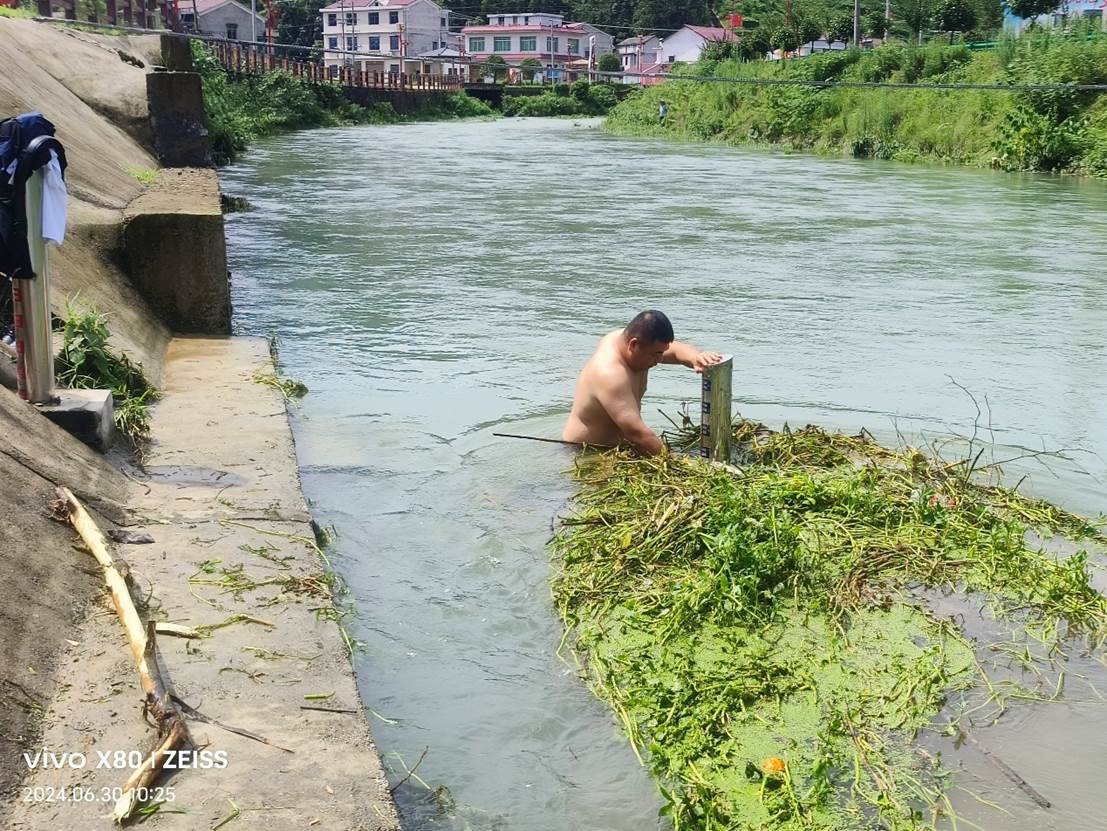 【迎战强降雨】水草缠绕水文监测杆 村支书跳水中清理