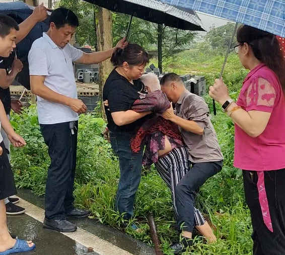 6月29日下午,石井头村片长彭笃军接到邻长刘胜军电话,巡查时发现一老人不慎摔倒路边杂草丛中,他一边寻找附近的村民帮忙施救,一边紧急报告村委,石井头村村干部闻讯急忙往事发点前往急救老人,在热心群众的帮忙下,大家扶的扶、抬的抬、打伞的打伞,同心协力把老人扶起来,老人是邻村的杨妈,今年82岁,这几天住女儿家,女儿有事外出一会,杨妈趁雨小了些,出来散散步,没想到因路面湿滑倒到了路肩下,所幸路边全是草,没有受伤,大家一起把老人扶起,安全护送回家。