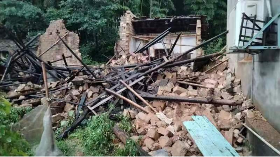 7月1日,肖国新的土砖房没能扛住这波雨水的冲击最终垮塌,土砖和房梁等杂乱的堆在一起,情形十分骇人。所幸大桥塘村两委谋划在前,已将夫妇俩安全转移,让他们避免了一场天灾。“关键时刻幸亏有你们,真的非常感谢大家。”肖国新夫妇看着垮塌的房子,拉着李正强支书的手,激动地说道。