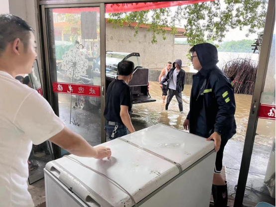 “各山塘水库留1名值守人员,其余应急救援队员按照预案分组,迅速到鲊埠社区和陶公庙村开展抢险,组织群众转移。”随着防汛指挥长李政辉乡长一声令下,鲊埠回族乡应急救援队、联村干部、村干部等70余人全部赶赴抗洪抢险救灾现场。大家分工合作,有的开着冲锋舟,或抱或背转移群众;有的齐心协力,抬着群众的冰箱、电视等贵重物品上二楼,抢救群众财产;有的搭梯上墙抢修受损电路,保障救援现场灯光;有的设置警示路牌,提醒群众注意涉水路面;有的安抚老人小孩,维持救援秩序。