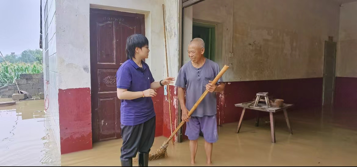 乘着竹排,我们缓缓向前。今年71岁的李大爷拿着扫帚,正在一楼清扫。老人告诉记者,昨晚村干部一时间就上门通知,要他转移至安全区域。考虑到自家是一栋二楼的楼房,所以老人家当晚没有转移到外面,而是在二楼居住。李大爷告诉记者,这次洪水来得快,退得也快,要加紧在洪水完全退去之前,将一楼的房子清扫干净。