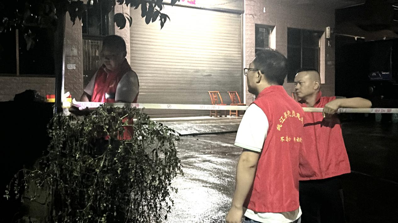 党员干部在淹水路段拉警戒线 蒋雯倩 摄