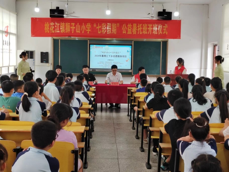 7月15日上午,“青春筑梦桃乡 用爱温暖童心”——“七彩假期”公益暑托班开班仪式在桃花江镇狮子山小学举行。