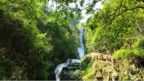 外国友人在导游的带领下,沿着山间小径漫步,欣赏着清澈的溪流、茂密的树林和远处层峦叠嶂的山峰,更被眼前那飘逸灵动、如同一条银链般从山崖上倾泻而下的罗溪所吸引,纷纷对景区的美丽景色赞不绝口。