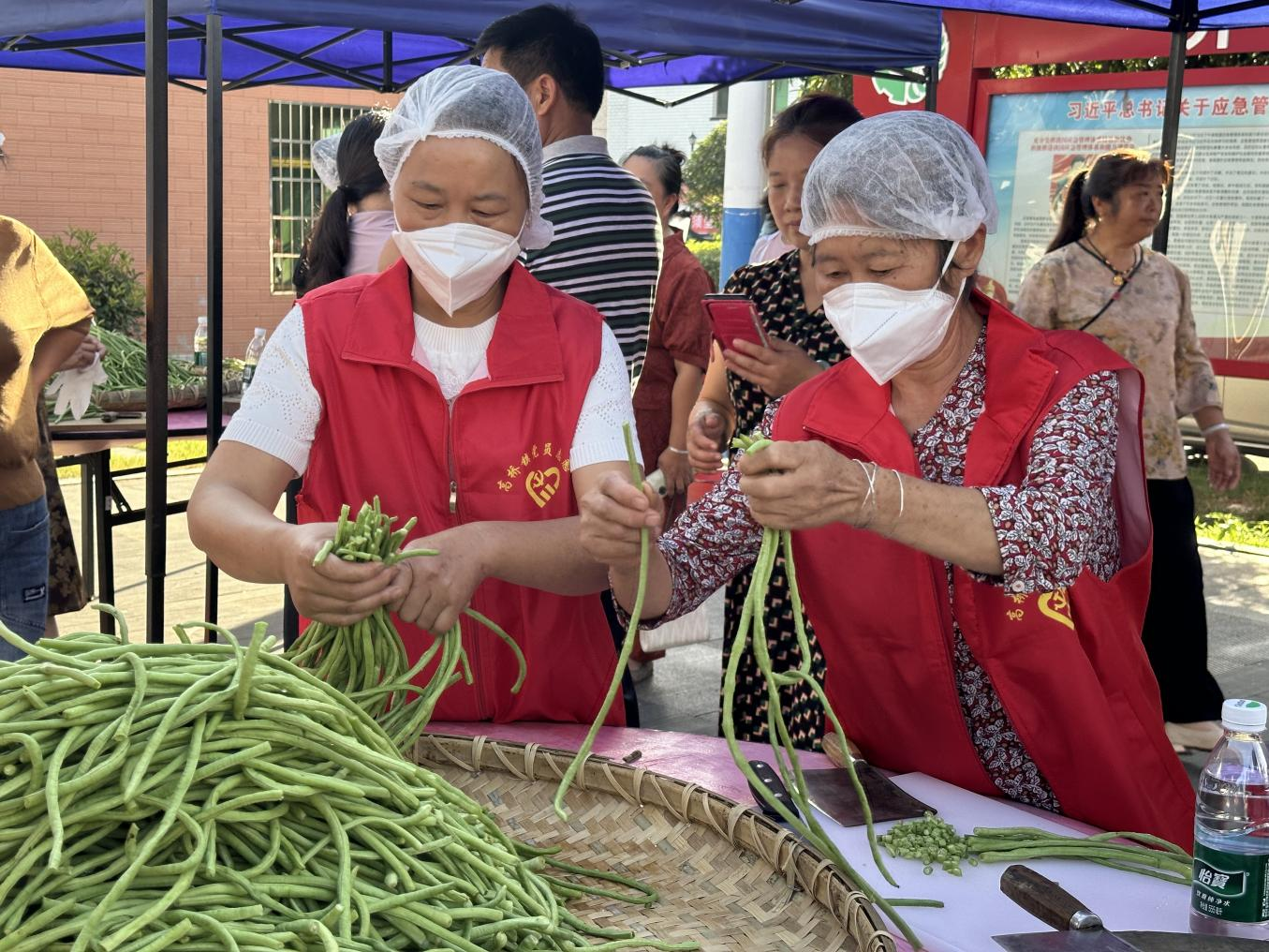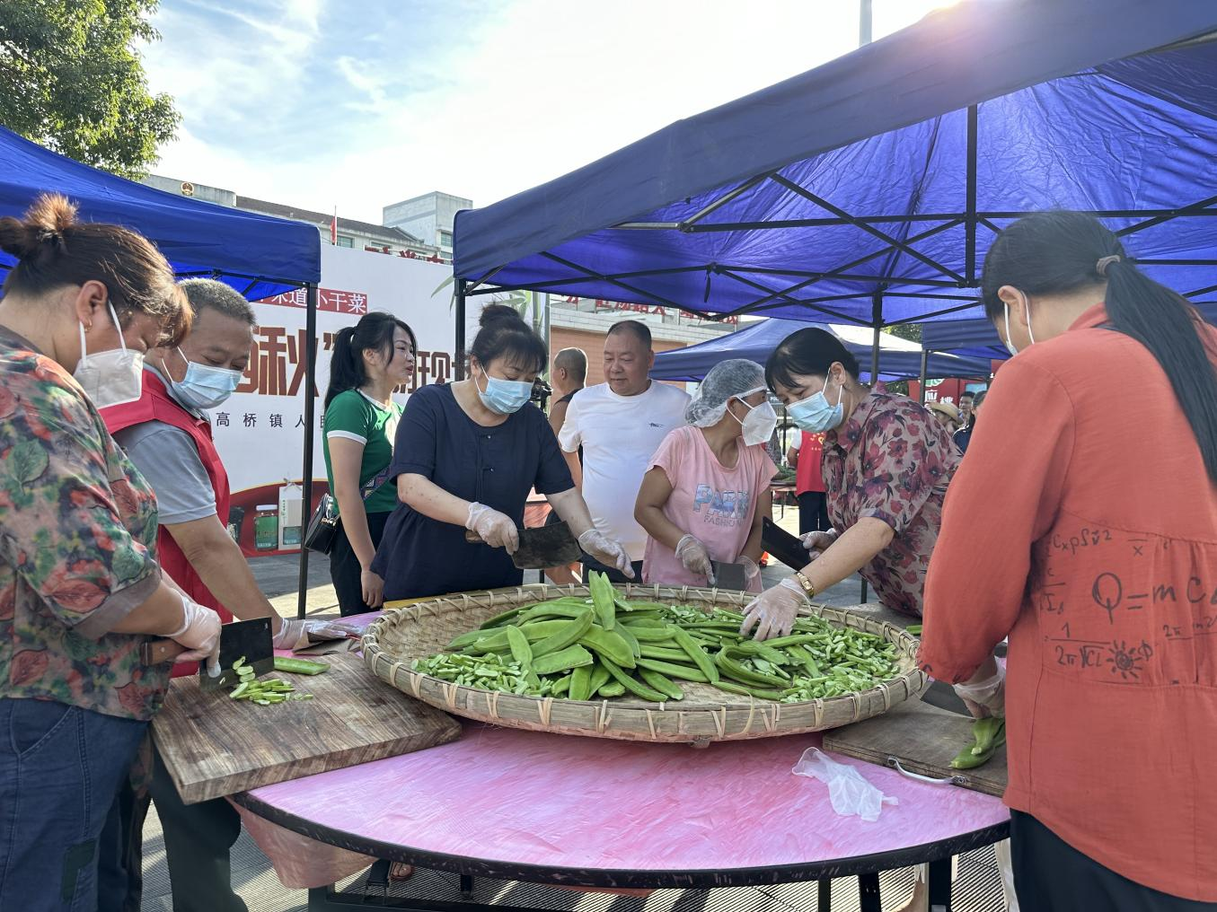 早上8点不到,在高桥镇集镇广场,参加培训的村民佩戴口罩、手套及发套,全神贯注地投入到晒制小干菜的学习中。高桥镇小干菜擂主刘茂勋夫妇和带货网红“蜜蜂姐姐”杨朝晖现场为村民们讲解了挑选蔬菜、切段薄厚、晾晒把控、卫生标准等每一个环节的要求,并作示范。