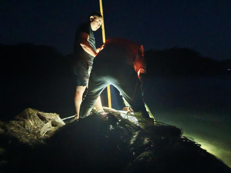 “我们要打起精神,不放过任何一个死角。”伴随着一声令下,队员们头顶探灯,手握电筒有条不紊地行动了起来,收缴和记录渔网、地笼等非法捕捞工具。
