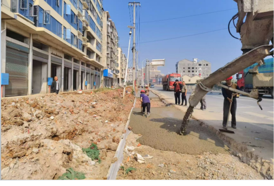 施工现场,一台搅拌机盛载的混凝土正倾泻而出,工人们忙着铲平路面、铺设路基、贴街沿石、安装雨水栅,一道道工序稳中有序地推进。