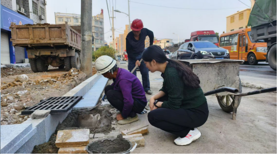 “用砂子混合水泥做粘剂,一根线、几块砖头、一块碎瓷片、一卷钢尺、一把锤子、一双‘尺’样的眼睛,几下就将雨水栅与街沿石齐平。”周边住户刘女士赞叹工人师傅精湛的技艺。