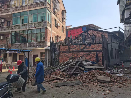 针对居士巷鉴定为D级的7处危房,镇党委政府建立“分管领导包案、工作小组包户、党员干部包人”的三级联动机制。通过入户宣传政策、召开屋场恳谈会、制定个性化处置方案,获得群众理解支持。在拆除过程中,同步做好警戒防护、人员转移和建筑垃圾清运工作,确保拆危过程安全有序。社区居民谢大爷感慨:“我家老屋开裂多年,严重影响我们的安全,干部们不仅帮我进行拆除,还全程协助搬家,心里特别踏实。”