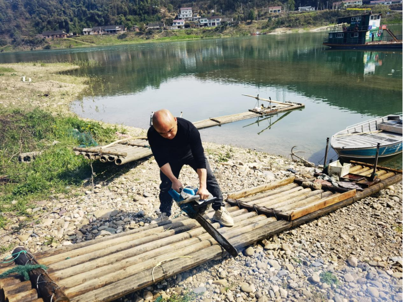 执法工作人员当场销毁捕鱼竹排 卢海洵 摄