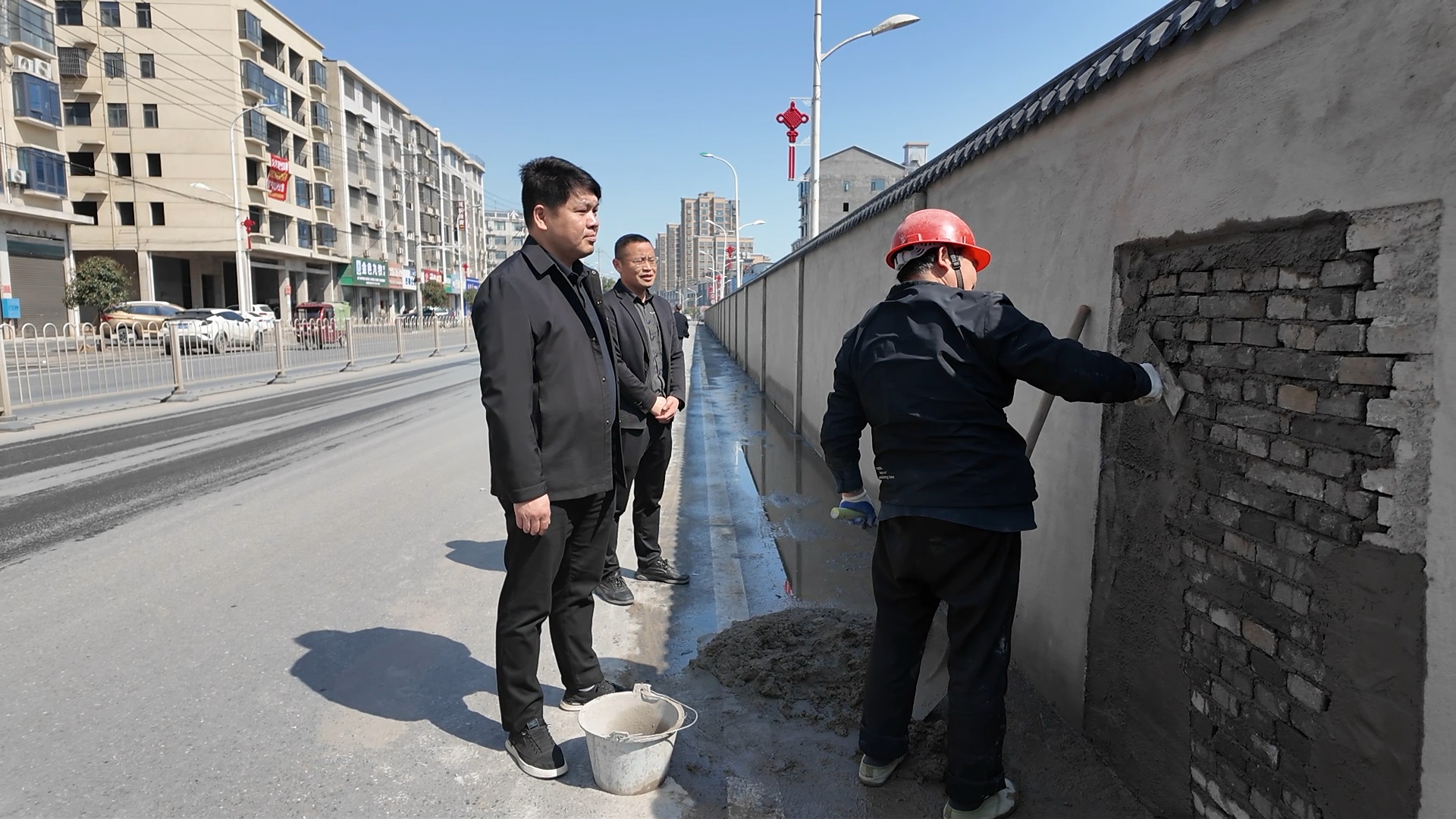 副镇长吴国春查看新建围墙施工进度 刘蓉 摄