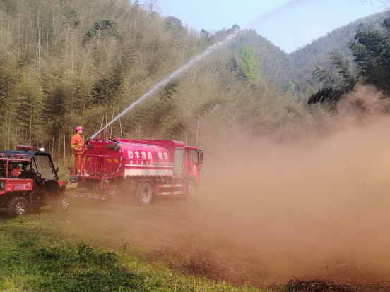 演练模拟该镇响涛源社区护林员巡查发现火情后,迅速逐级上报到社区及该镇应急指挥中心。镇应急指挥中心按照应急预案,迅速组织镇村两级救援队伍奔赴现场。队员们分工明确,配合默契,综合运用砍隔离带、消防水车、消防摩托、二号工具等多种灭火手段,成功将火扑灭,达到了预期演练效果。