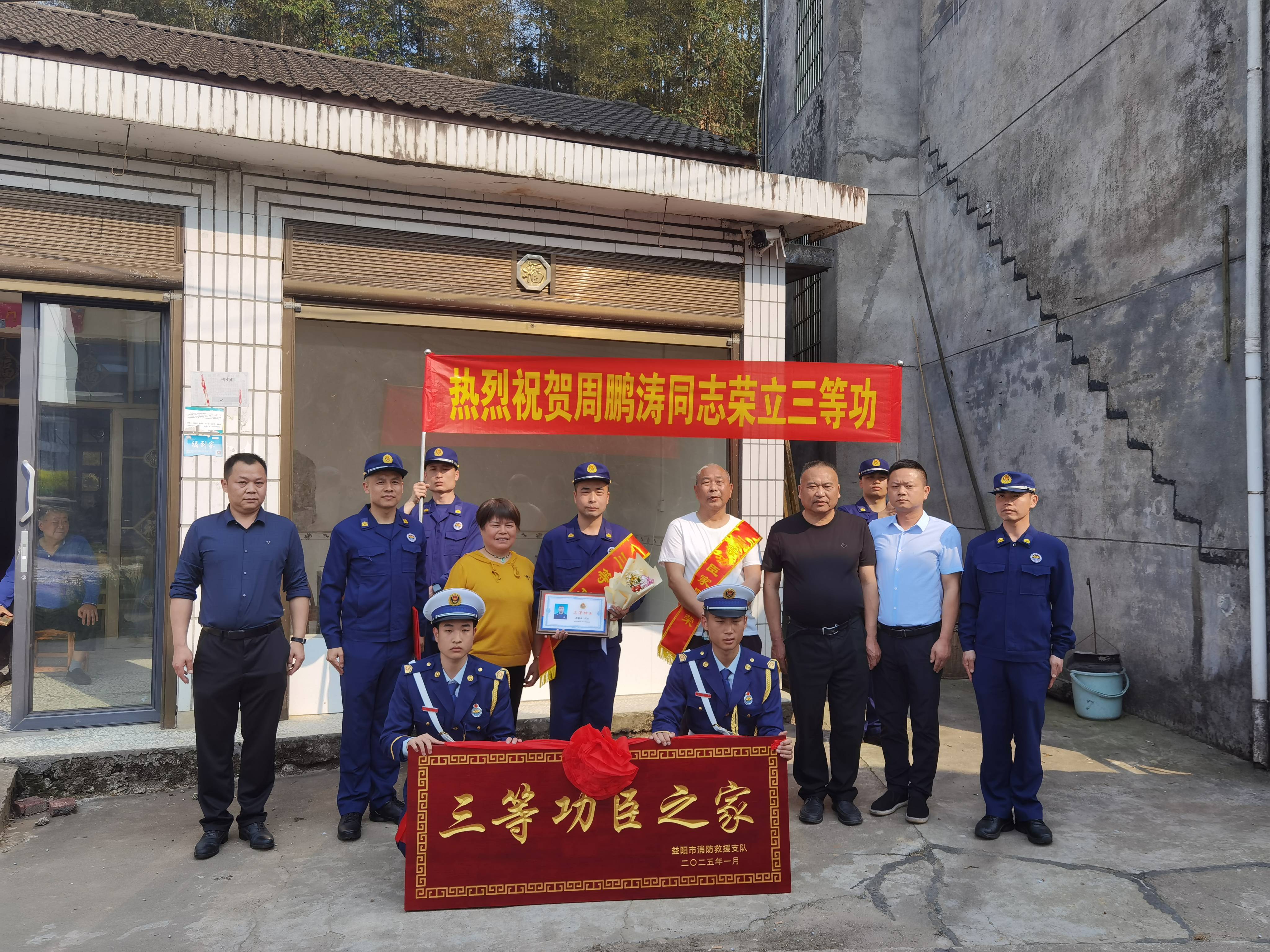 3月26日,益阳高新区消防大队联合武潭镇政府组成慰问组,将三等功立功喜报、荣誉证书和牌匾送至周鹏涛家中。