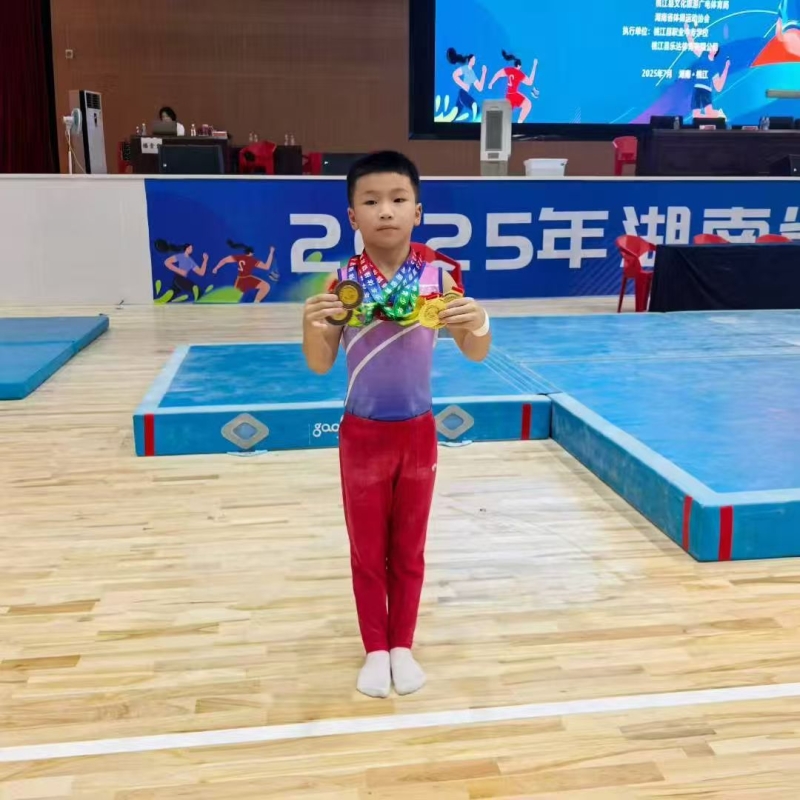 来自桃江县鸬鹚渡镇张子清村的8岁小将杨培懿表现优异,在本届赛事中一人夺得四枚金牌和两枚铜牌。据了解,杨培懿自2024年下半年进入省体操运动学校就读,正式开始体操训练尚不足一年时间,在较短时间内取得这一成绩,实属不易。