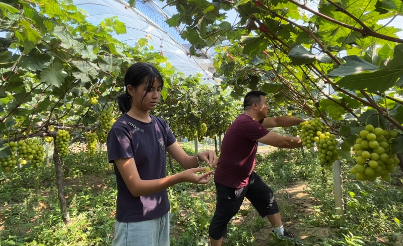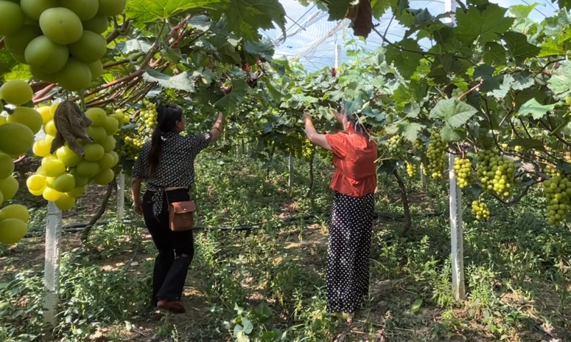 当地村民胡配花2020年开始在农场做活,她表示,在这里每天能收入150元,一年能工作3个月以上,为家庭增收1万多元,既不耽误农活还能照顾家里,日子就像这葡萄一样甜。