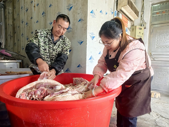 刘小红在村民王国交家查看腌制的猪肉 陈明 摄