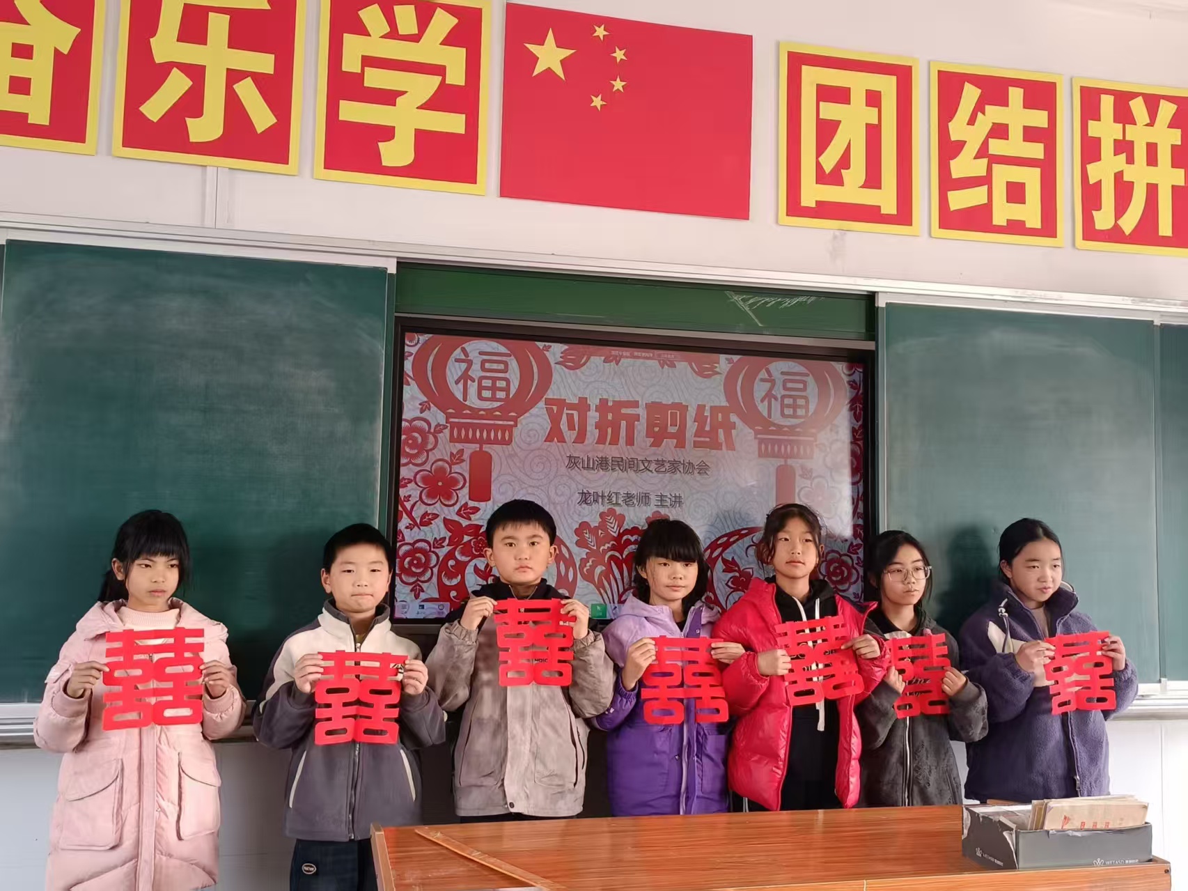 作为剪纸技艺的资深传承者,龙叶红以"对折剪纸"为核心教学内容,从纸张折叠的角度把控、剪刀使用的力度技巧,到图案设计的寓意内涵,进行了层层递进的细致讲解。"先对折两次,边角对齐不能歪,剪曲线的时候要慢一点..."她一边示范一边叮嘱,红纸在剪刀开合间化作简约流畅的线条,转眼就变成了寓意吉祥的"囍"字、栩栩如生的小花。在老师的耐心指导下,学生们纷纷拿起工具动手尝试,从最初的生疏犹豫到逐渐熟练上手,专注的眼神里满是对传统技艺的好奇与热爱。当一张张亲手制作的剪纸作品被高高举起时,教室里洋溢着满满的成就感,欢声笑语中定格下非遗传承的温暖瞬间。