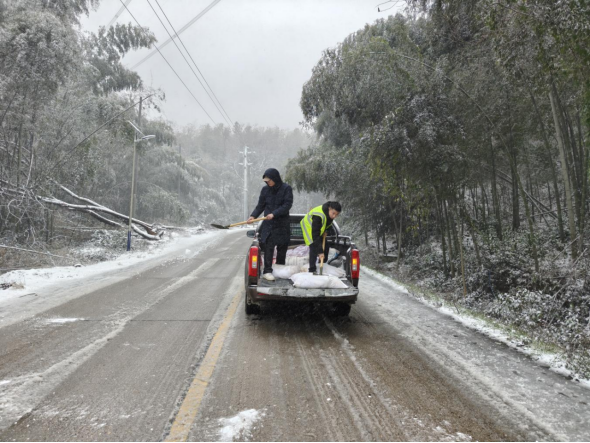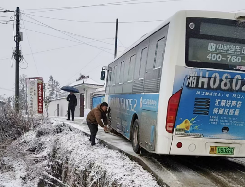 1月20日上午,张家村一段陡坡路段结冰严重,一辆载有5名乘客的公交车车轮打滑、多次上坡失败,情况紧急。正在附近巡查的张家村新一任党总支部书记曾琼华发现后,立即组织新一任支部班子成员扛来融雪盐包,俯身弯腰,将颗粒均匀撒在公交车四个轮胎周围。随着盐粒在冰面迅速起效,轮胎摩擦力逐渐恢复,公交车终于稳稳驶过坡道。乘客们透过车窗挥手致意:“谢谢你们,为咱们村干部点赞!”