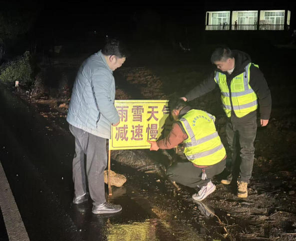 1月19日,夜幕降临,气温骤降,正是道路结冰高风险时段。由党委委员、副镇长龚成带队,镇应急办组建夜间巡查专班,对全镇主干道、桥梁、陡坡及事故易发路段开展不间断巡查。在易结冰、急弯、临水临崖等危险路段,巡查人员连夜设置醒目的安全警示牌18块,提醒过往车辆减速慢行。一道道警示标识,在黑夜里为行人车辆点亮了“安全灯”。