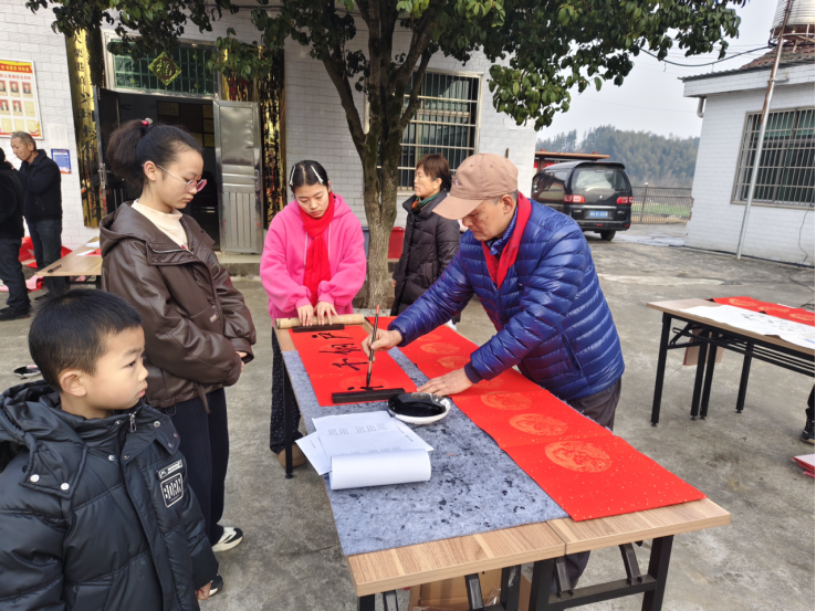 春节前夕,大栗港镇兴坪村村民服务中心广场上热闹非凡,一场“送春联下乡”文化惠民活动正在开展。