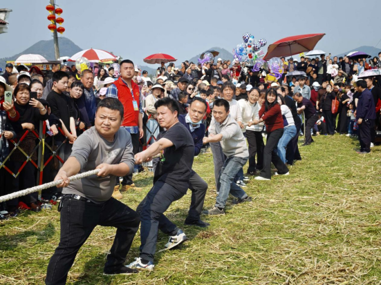 以花为媒,不止于赏。本次活动将文艺展演、群众竞技、民俗互动、农产展销深度融合,让游客在移步换景中感受田园之美。民俗体验区里,打糍粑、制擂茶热气腾腾,竹编、龙舟文化展示引得游人驻足;农产品展销区人头攒动,龙头湾面条、茶籽油等本土特产让游客争相品鉴选购。一根麻绳,连接的是集体荣誉;一场比拼,凝聚的是奋进力量。这场“村拔”赛,已然成为各村凝心聚力的展示台。