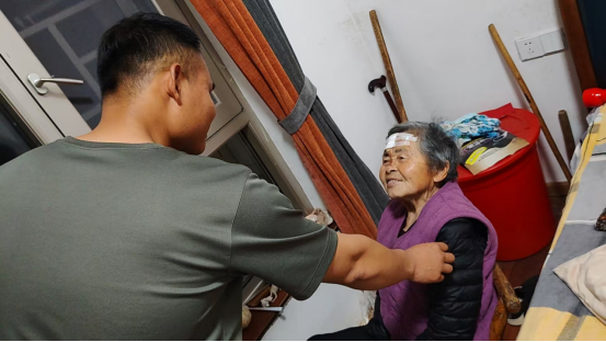 情况紧急,高启龙果断停车,与母亲前往事发地救援。他顾不上田间泥泞,当即脱下鞋袜冲向老人。此时,86岁的杨奶奶额头磕破、鲜血直流,神情十分痛苦。高启龙立刻运用部队所学的急救知识检查老人,确认无骨折后迅速为其止血,并叮嘱母亲及时呼救。
