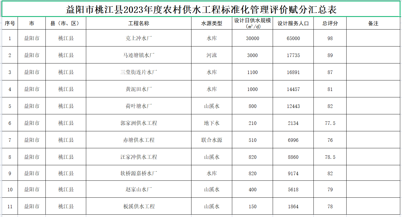 附件:益阳市桃江县2023年度农村供水工程标准化管理评价工程汇总表