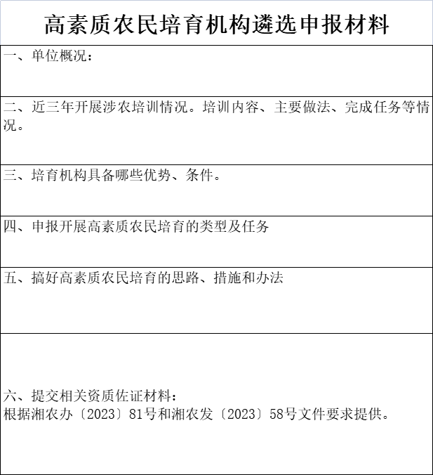 根据《湖南省2023年高素质农民培育工作实施方案》(湘农办发〔2023〕81号)和《湖南省高素质农民培育规范》文件要求,为实施好高素质农民培育,充分发挥农民科技教育培训机构的作用,为职业农民提供便捷服务,特向社会遴选高素质农民培育机构,现就相关事宜公告如下: