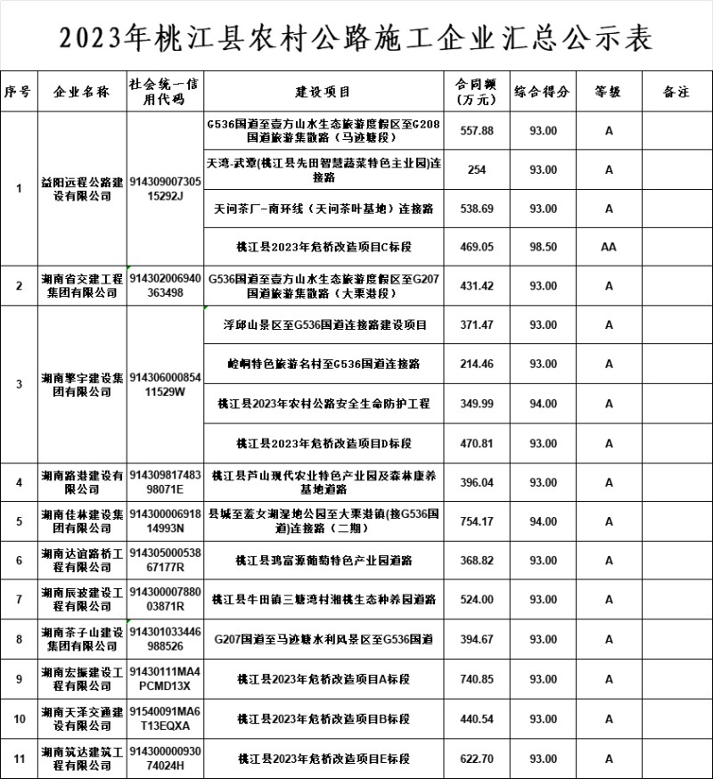 桃江县2023年度农村公路施工企业信用评价结果的公示