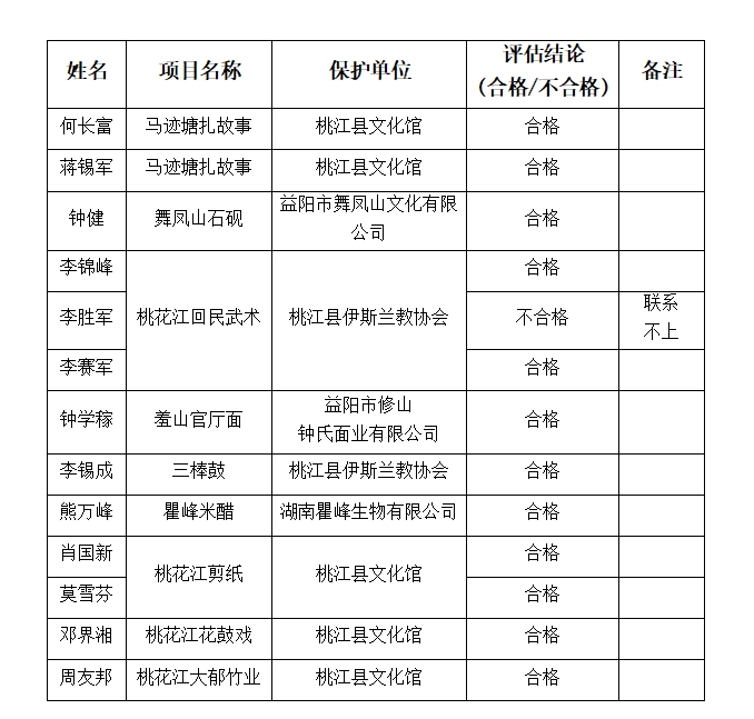 根据益阳市文化旅游广电体育局关于开展2023年度市级非物质文化遗产代表性传承人传承活动评估工作的通知要求,我局对本县市级非遗传承人年度传承活动开展情况进行初步评估,经研究决定,评估结论如下: