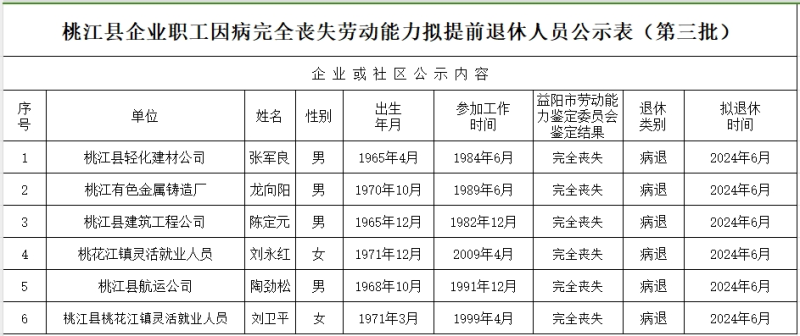 根据有关文件精神,经益阳市劳动能力鉴定委员会鉴定,现将第三批6名企业职工的劳动能力鉴定结果予以公示(名单附后)。如对鉴定结果有异议者,可在公示期内向12333或县人社局养老保险股(联系电话:0737-8824202)进行实名举报,举报内容必须真实。公示期限为2024年8月22日至2024年8月28日。公示期满后,不再受理举报。