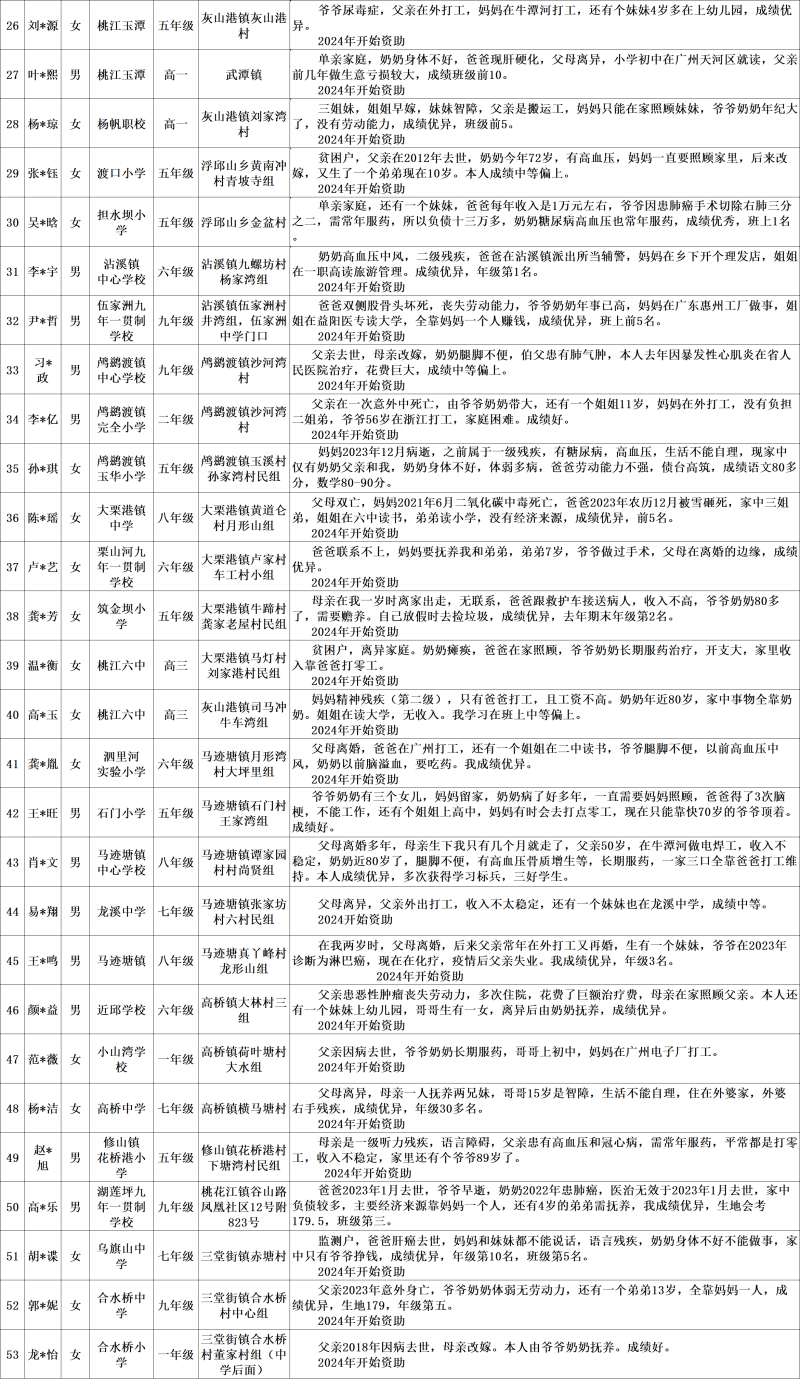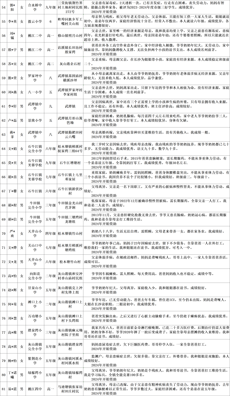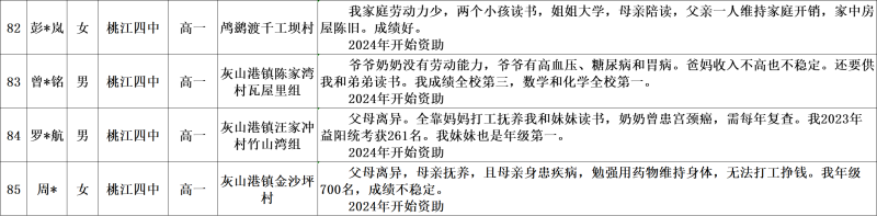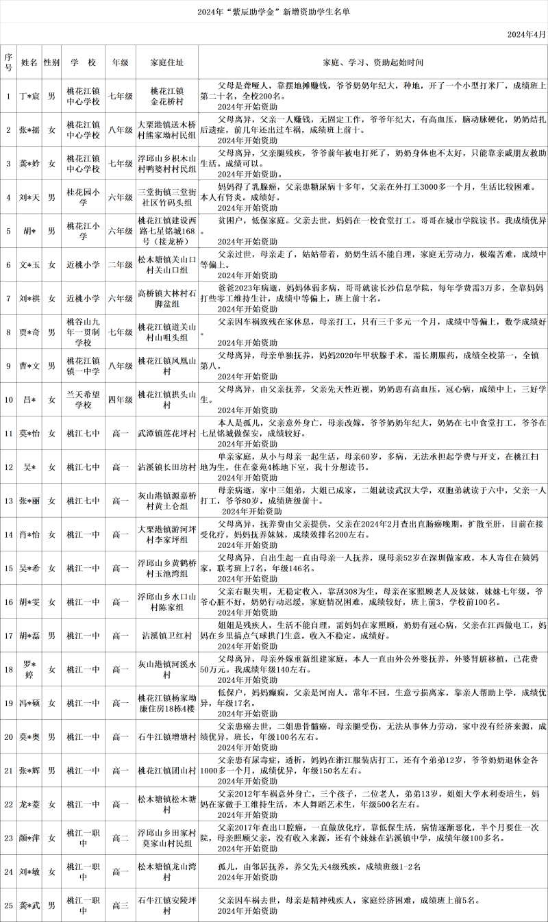 湖南省益阳市紫辰文化教育基金会(以下简称基金会)2024年将在全县中、小学生中,新增选90名家庭经济特别困难且品学兼优的在校学生予以“紫辰助学金”资助。根据桃江县教育局与基金会联合下发的《关于做好2024年“紫辰助学金”申报选定发放工作的通知》(已于2024年3月12日在该网发布),基金会、县教育局、全县各学校经广泛动员、严格审核,已初定85名在校学生,纳入2024年“紫辰助学金”资助,现将有关情况公示如下: