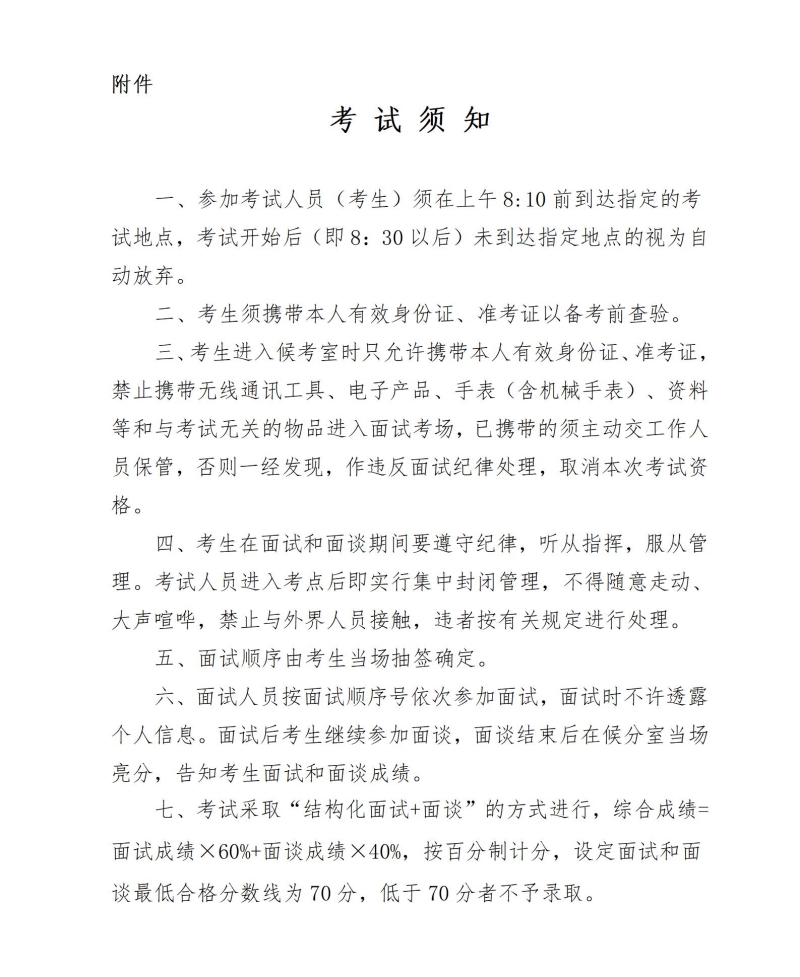 1. 考试采取“结构化面试+面谈”的方式进行,综合成绩=面试成绩×60%+面谈成绩×40%。