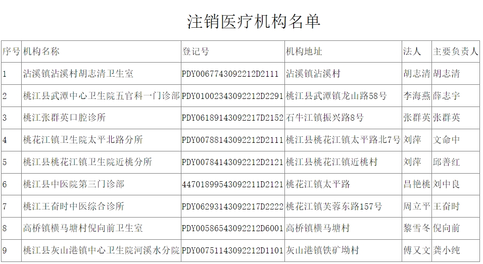 根据《中华人民共和国行政许可法》《医疗机构管理条例》《医疗机构管理条例实施细则》以及《医疗机构校验管理办法(试行)》等法律法规规定,沾溪镇沾溪村胡志清卫生室、桃江县武潭中心卫生院五官科一门诊部、桃江张群英口腔诊所、桃花江镇卫生院太平北路分所、桃江县桃花江镇卫生院近桃分所、桃江县中医医院第三门诊、桃江王奋时中医综合诊所、桃江县灰山港镇中心卫生院河溪水分院、高桥镇横马塘村倪向前卫生室9家医疗机构因逾期未提出校验申请或备案,且经催告后仍未在限期内申请校验,经医疗机构法人或主要负责人提出注销申请,现依法予以注销。