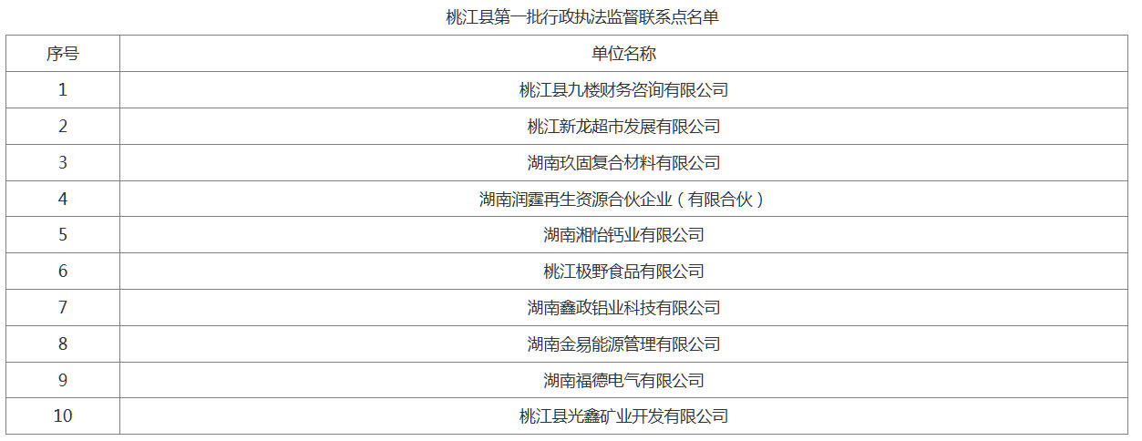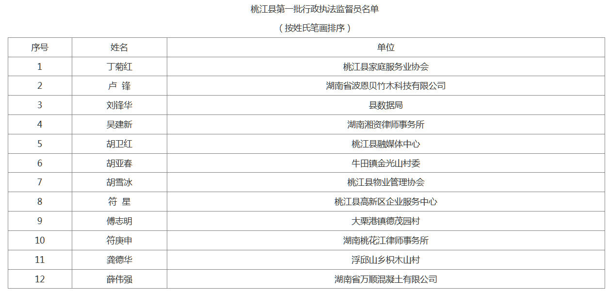 为加强桃江县行政执法协调监督体系建设,拓宽行政执法监督渠道,深入推进严格规范公正文明执法,优化法治化营商环境。经自主报名、单位推荐、定向邀请和资格审查,现将我县第一批行政执法监督联系点和行政执法监督员通告如下(见附件)。