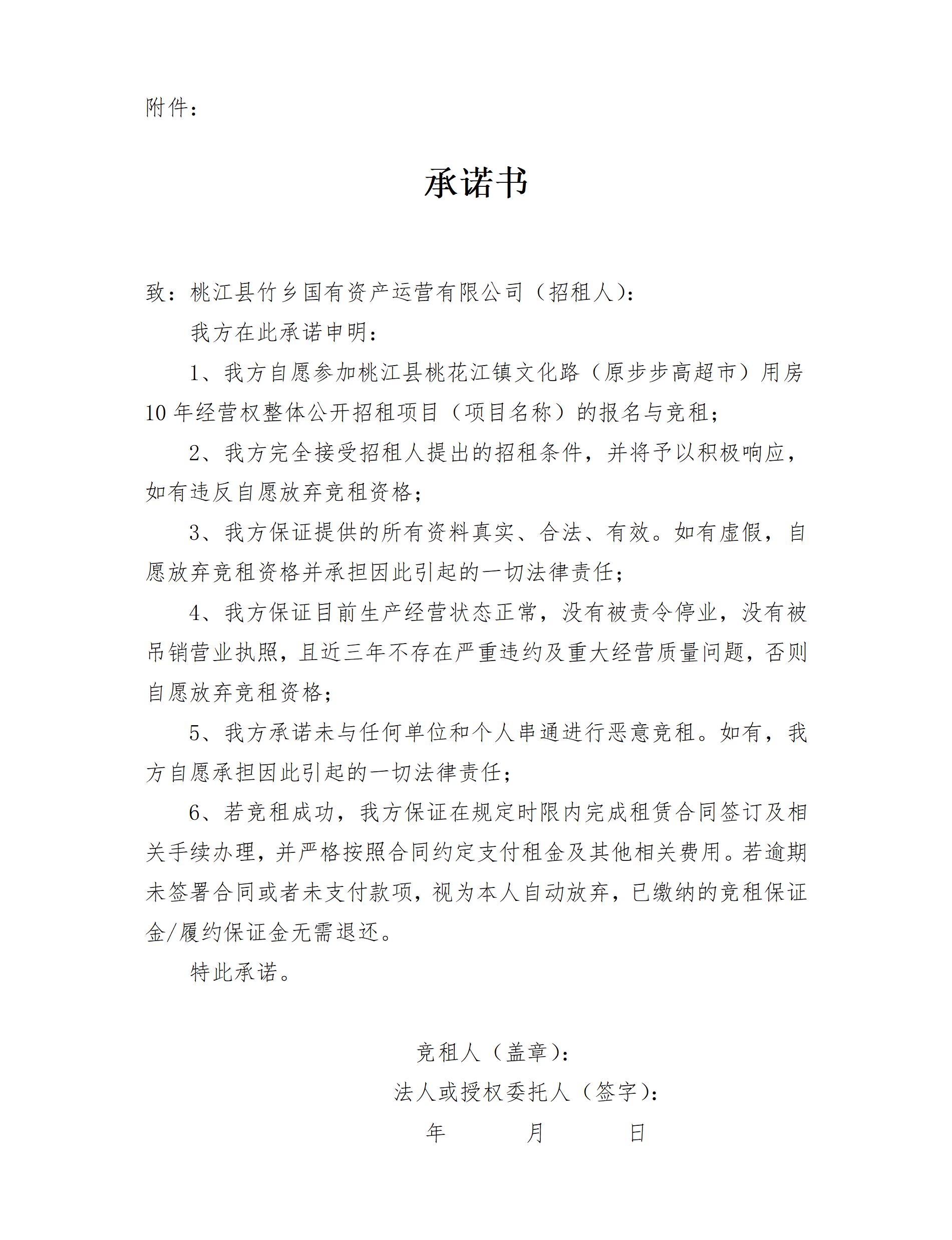桃江县竹乡国有资产运营有限公司(招租人名称)的 桃江县桃花江镇文化路(原步步高超市)用房10年经营权整体公开招租项目 (项目名称)进行公开招租,现邀请合格的企业法人参加竞租。