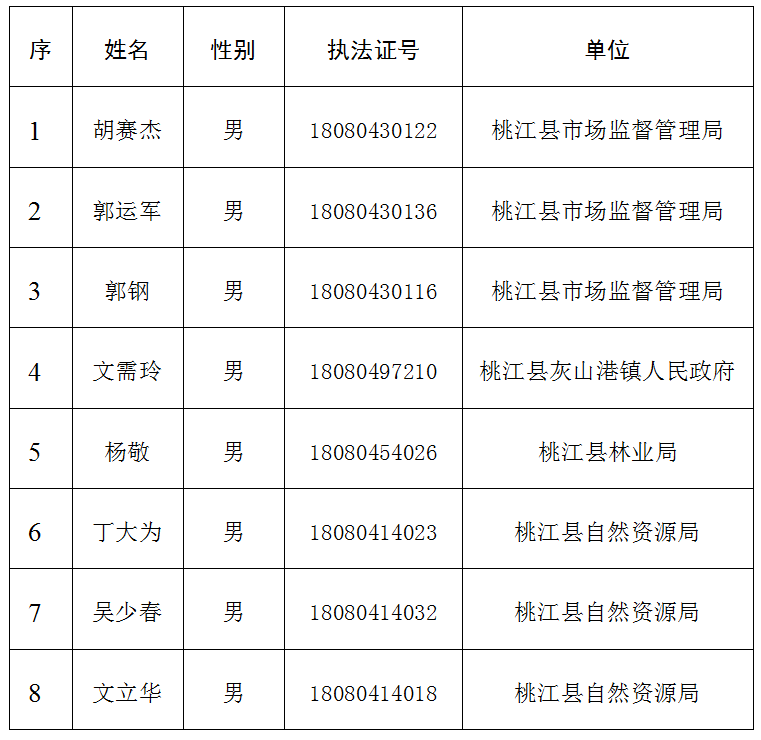 根据《湖南省行政执法人员和行政执法辅助人员管理办法》第十二条、第二十八条第(五)项之规定,经审定,对下列8名违法违纪的行政执法人员取消行政执法资格,吊销行政执法证件。
