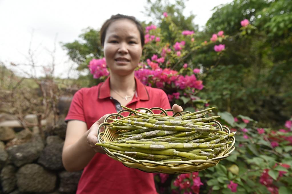 2019年3月14日,村民在海南海口市秀英区石山镇施茶村石斛园展示新鲜的石斛。新华社记者 鲁鹏 摄