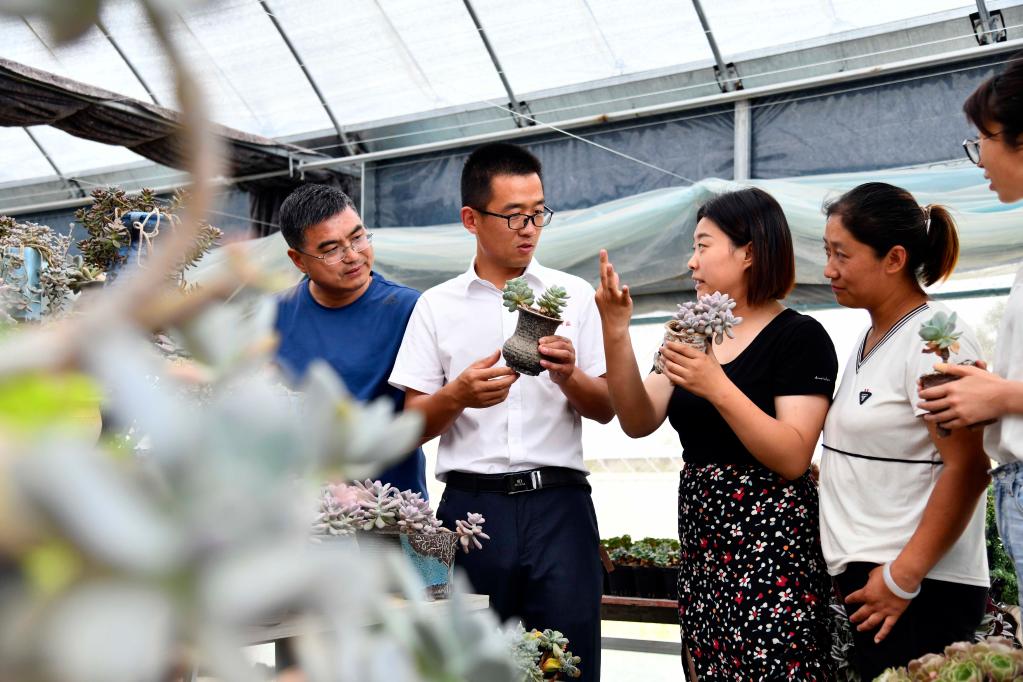 2020年6月9日,在济南市章丘区三涧溪村农业创业园,青年创业党支部书记王元虎(左二)和青年党员一起商量发展事宜。新华社记者 王凯 摄