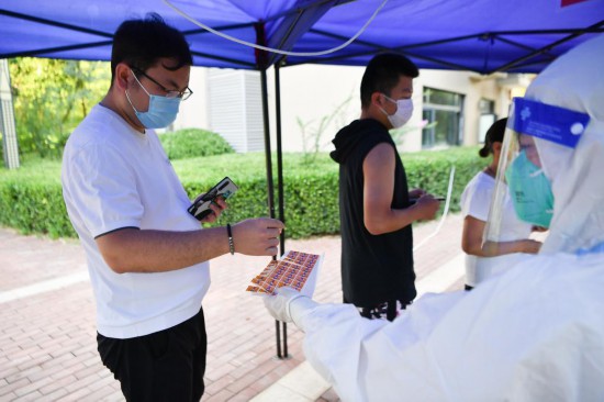 7月8日,志愿者(右)向西安市曲江新区紫汀苑社区居民发放核酸检测贴纸。新华社记者 张博文 摄