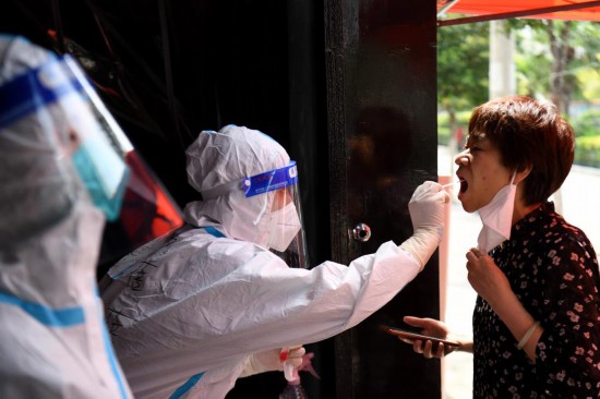 7月3日,在安徽省宿州市泗县虹城街道东关社区,医务人员为居民进行核酸采样。新华社记者 黄博涵 摄