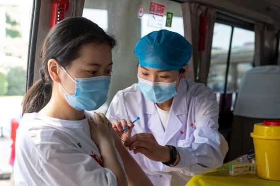 5月20日,在郑州市金水区花园路与金水路交叉口,市民在新冠疫苗接种车上接种疫苗。新华社记者 徐嘉懿 摄
